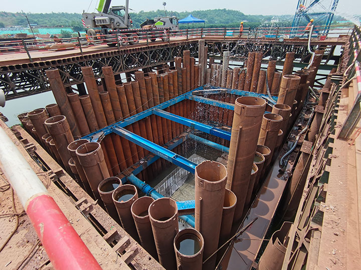 蟠龍大橋主橋涉水施工措施是技術難點、重要性節(jié)點、施工危險性較大工程之一,主要技術難點在于水中墩柱承臺的圍堰施工,針對薄覆蓋層硬質河床、承臺入巖等水文地質、設計要求,工程管理公司黨總支在蟠龍大橋項目成立黨員先鋒隊攻堅小組,精心組織、知難而上、勇于探索,在水中P17#、P18#墩采用了“成套鎖扣鋼管樁(φ630)+全套管全回轉鉆引孔開槽+清槽嵌固+封底”的圍堰方案,成功破解了項目建設中,水中薄覆蓋層硬質河床引孔開槽、鋼管樁搭設鎖扣、反循環(huán)清槽、細石混凝土封槽、鎖扣止水等技術難點。