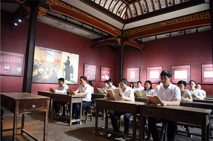 在興國縣蘇維埃政府所在地——瀲江書院,毛主席在這里舉辦了興國縣土地革命干部訓練班,為中央蘇區(qū)的土地革命培養(yǎng)了第一批斗爭骨干,建立了興國縣第一個革命政權。大家在土地革命干部訓練班舊址學堂內(nèi),集體誦讀了一段土地革命時期的歷史,當朗朗書聲再次在書院響起,珍貴的革命記憶浮于腦海,激勵黨員們延續(xù)紅色根脈、傳承紅色基因。