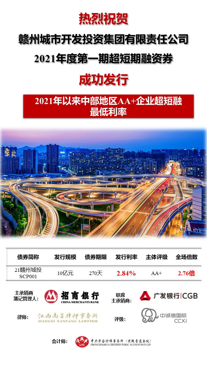 近日,贛州城投集團2021年度第一期超短期融資券(SCP001)在銀行間債券市場成功發(fā)行,金額10億元、票面利率2.84%、發(fā)行期限270天,全場認購倍數(shù)2.76倍,創(chuàng)2021年以來中部地區(qū)AA+企業(yè)超短融最低利率。