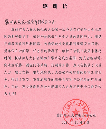 這次圓滿完成市“兩會”會務(wù)保障工作,并獲得市人大、市政協(xié)感謝信表揚(yáng),是對集團(tuán)上下講政治、講擔(dān)當(dāng)、講大局的認(rèn)可與褒獎。第三屆世界贛商大會召開在即,大會開幕式將在贛州大劇院舉辦,民晟實(shí)業(yè)公司等相關(guān)單位將再接再厲,熱情服務(wù)好各界賓朋,充分展示新時代國企的擔(dān)當(dāng)作為。