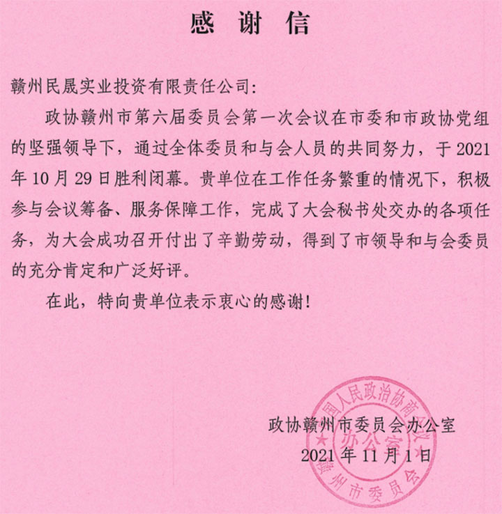 (民晟實(shí)業(yè)公司收到市人大、市政協(xié)的感謝信)