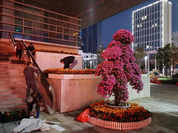 工程公司項目部克服當(dāng)前人員少、項目建設(shè)工作任務(wù)重的困難,安排專人日夜施工,及時完成了外圍綠化提升,聯(lián)合民晟實(shí)業(yè)公司實(shí)施氛圍營造工程,打造了一個莊重喜慶的會場氛圍。