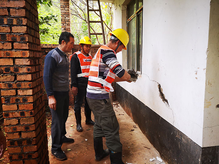收到群眾訴求后,贛州建工集團(tuán)黨支部明確責(zé)任分工,由贛州建工集團(tuán)駐蓉江花園(四區(qū))項(xiàng)目部的工作人員前往實(shí)地了解情況。該村村民邱家飛年近七旬,所居住的房屋因年久失修,導(dǎo)致門廳墻面破損,房屋內(nèi)外均存在一定程度的裂縫。此外,村里另有一對(duì)姐弟居住的房屋由于結(jié)構(gòu)問題也存在幾處裂縫。
