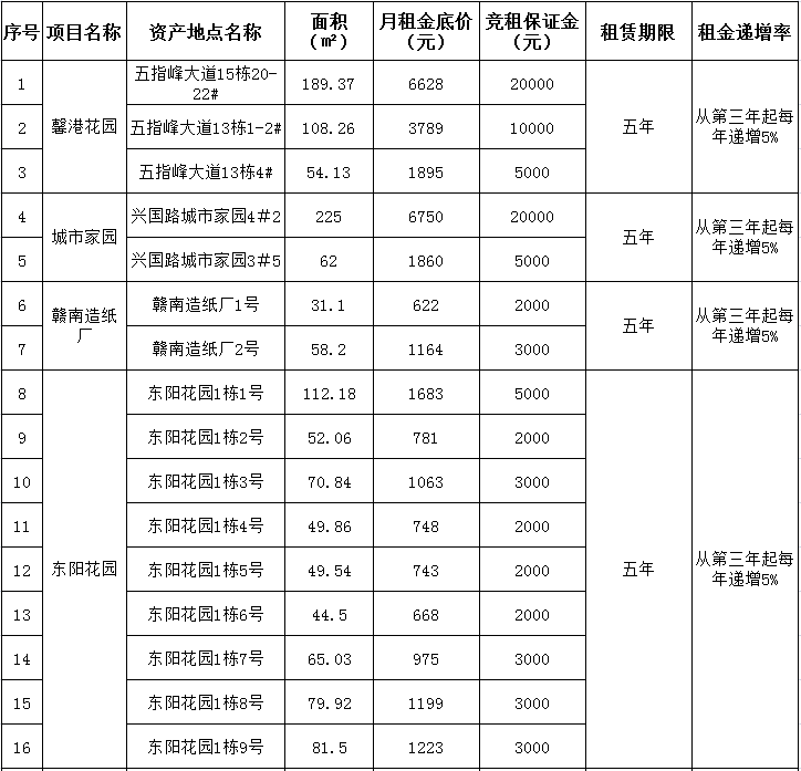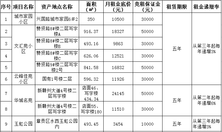 贛州振興實(shí)業(yè)有限責(zé)任公司委托江西潤(rùn)資拍賣(mài)有限公司,定于2020年10月27日10:00開(kāi)始在贛州市公共資源交易中心(長(zhǎng)征大道9號(hào))進(jìn)行國(guó)有資產(chǎn)公開(kāi)招租,現(xiàn)歡迎符合條件的單位或個(gè)人前來(lái)報(bào)名參加競(jìng)租。