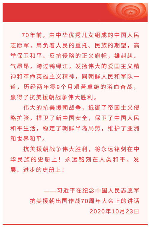1950年10月8日,毛澤東發(fā)布命令,組建以彭德懷為司令員兼政治委員的中國(guó)人民志愿軍。19日,志愿軍雄赳赳氣昂昂跨過鴨綠江。這是以正義之師行正義之舉。中國(guó)人民志愿軍同朝鮮軍民密切配合,首戰(zhàn)兩水洞、激戰(zhàn)云山城,會(huì)戰(zhàn)清川江、鏖戰(zhàn)長(zhǎng)津湖等,此后又構(gòu)筑起銅墻鐵壁般的縱深防御陣地,實(shí)施多次進(jìn)攻戰(zhàn)役,粉碎“絞殺戰(zhàn)”、抵御“細(xì)菌戰(zhàn)”、血戰(zhàn)上甘嶺,創(chuàng)造了威武雄壯的戰(zhàn)爭(zhēng)偉業(yè)。
