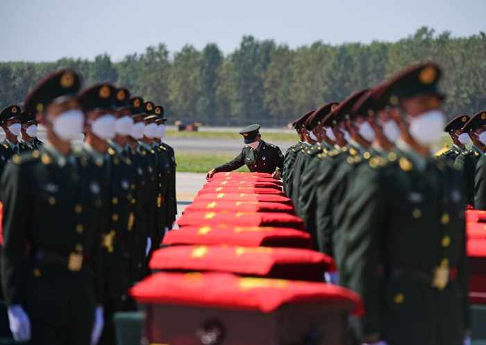 △2021年9月2日,在沈陽桃仙國(guó)際機(jī)場(chǎng),禮兵在殮放志愿軍烈士遺骸的棺槨上覆蓋國(guó)旗。當(dāng)日,第八批在韓中國(guó)人民志愿軍烈士遺骸由我空軍專機(jī)護(hù)送從韓國(guó)接回遼寧沈陽,109位志愿軍烈士英靈及1226件相關(guān)遺物回到祖國(guó)懷抱。新華社記者 楊青 攝
